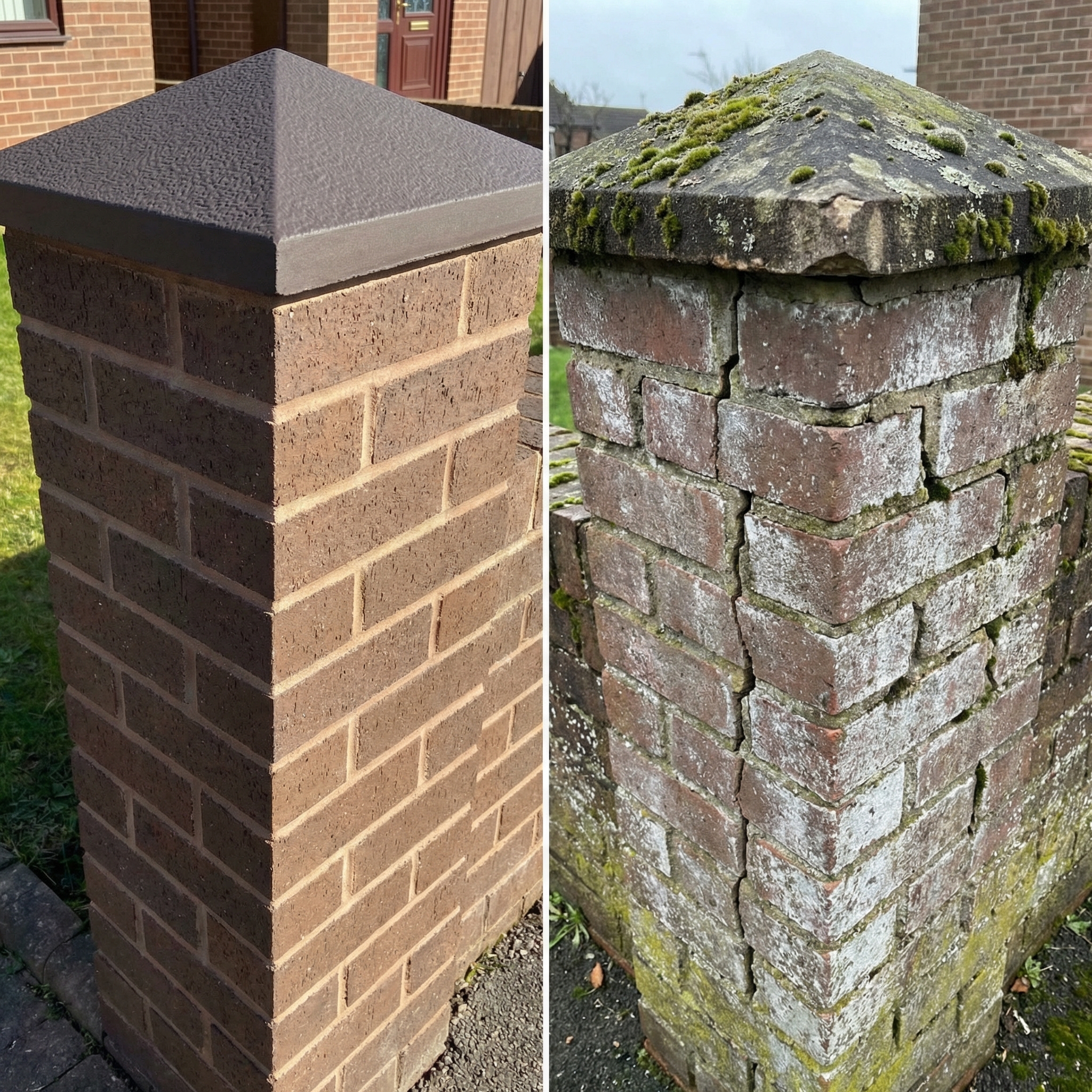• Разрушение столба. Разрушаясь сам, колпак перестает защищать столб. Вода проникает в кирпичную кладку или бетонный столб, запуская тот же разрушительный процесс уже в основной конструкции.