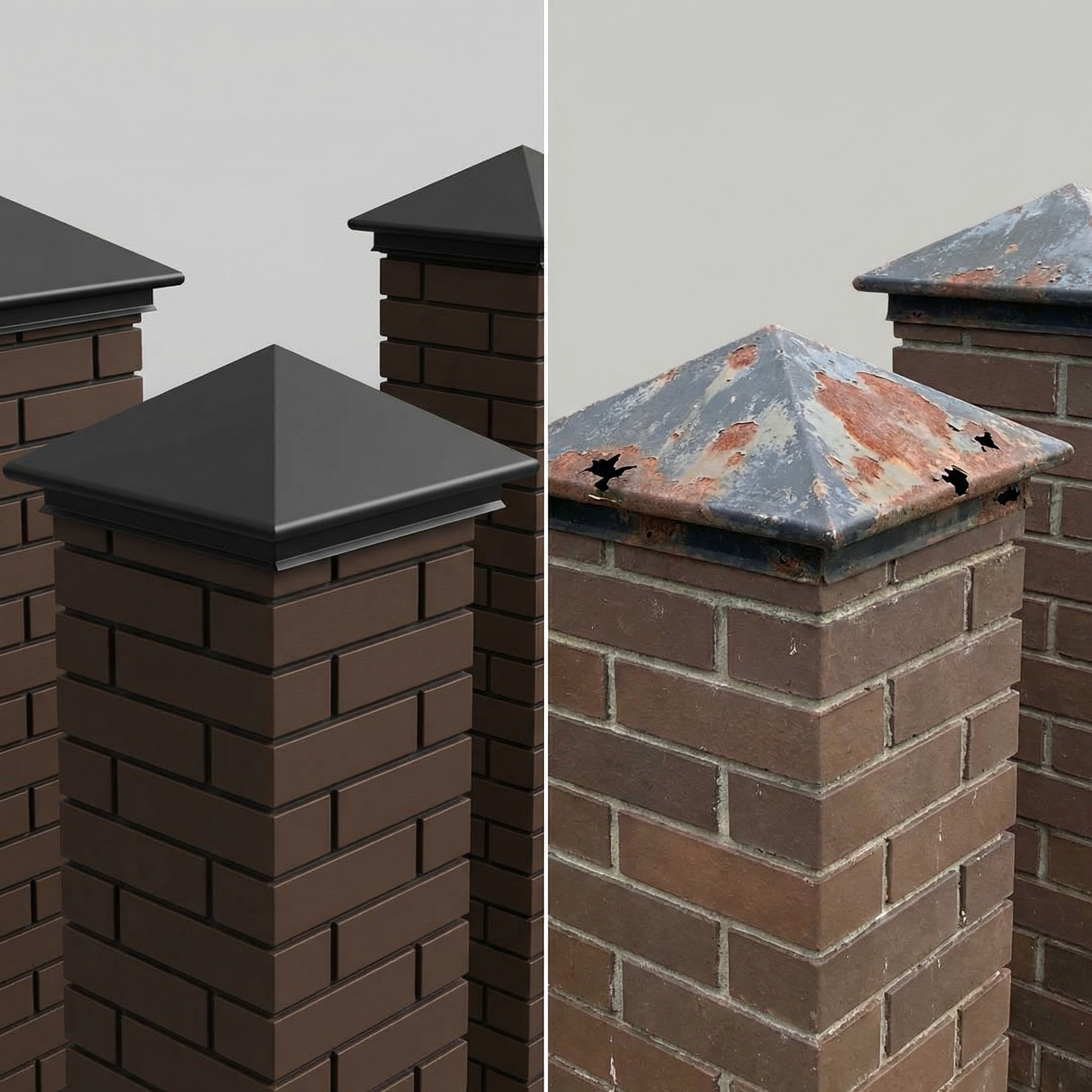 Окрашенный или оцинкованный металлический колпак выглядит стильно и современно… но только в первый год. Его ахиллесова пята — коррозия.